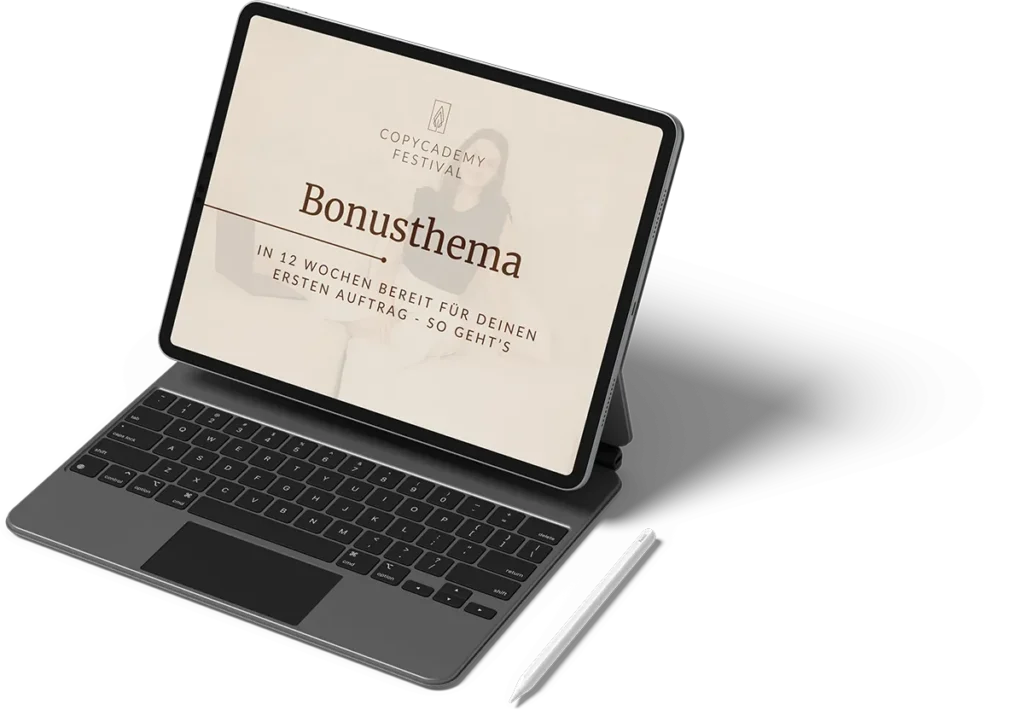 Auf dem Copycademy-Festival zeige ich dir, wie auch du deine zeitlich freie, ortsunabhängige Copywriting-Selbstständigkeit aufbauen kannst, die zu deinem Leben passt – egal, was du beruflich gerade machst. Kommst du?